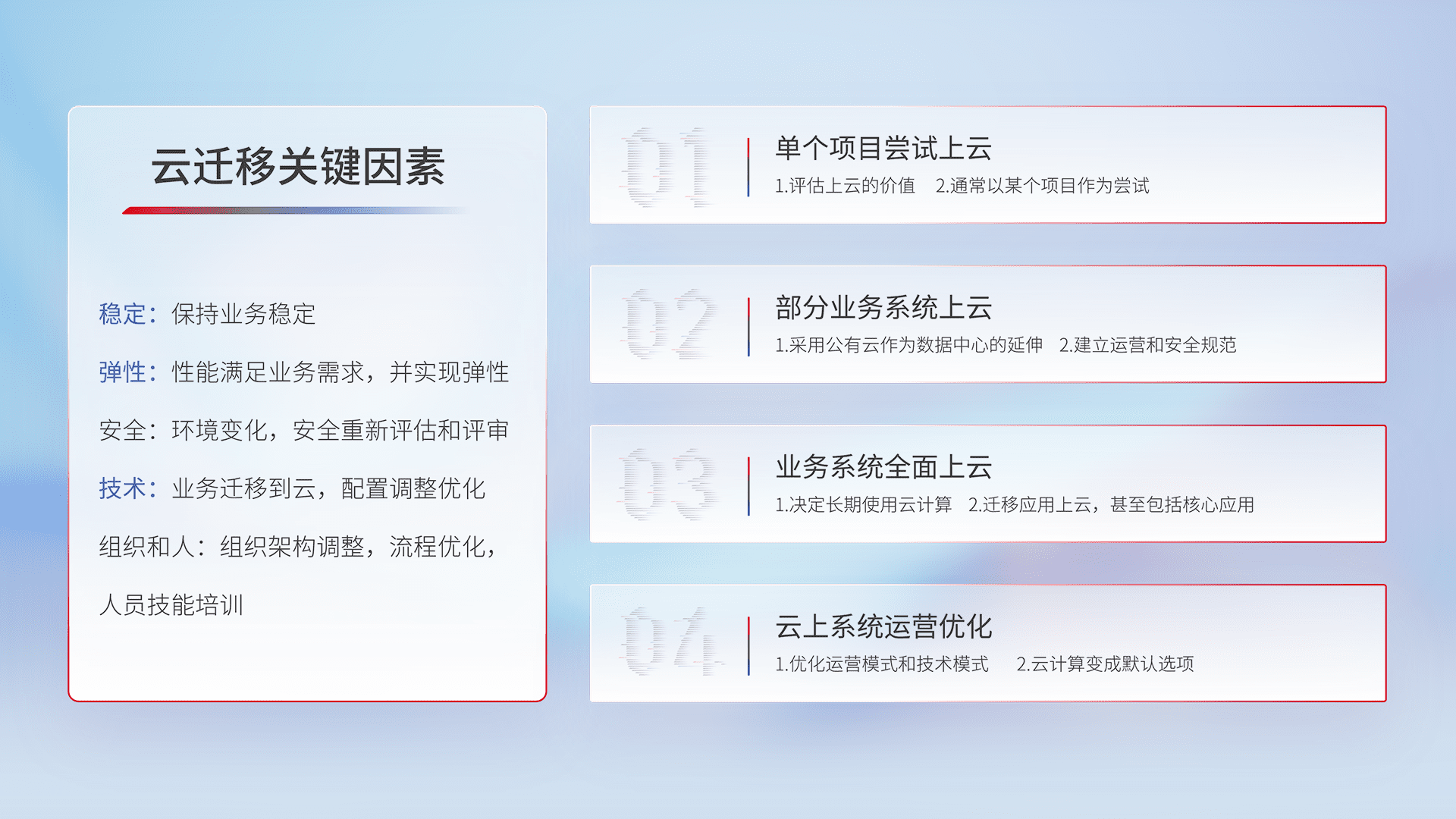 结合实际业务,,,,从规划设计、、云平台选型、、云原生改造、、、、数据迁移、、、集成交付,,,,迁移全过程为客户识别最佳上云路径,,,,做好风险识别管理,,,,设计网络架构、、身份权限、、、安全审计合规、、、操作审计、、日志审计、、、监控告警策略、、、、多站点容灾设计等,,对云上基础设施进行整体规划,,提升IT治理水平,,,,以满足弹性、、高可用、、、高性能的需求。。