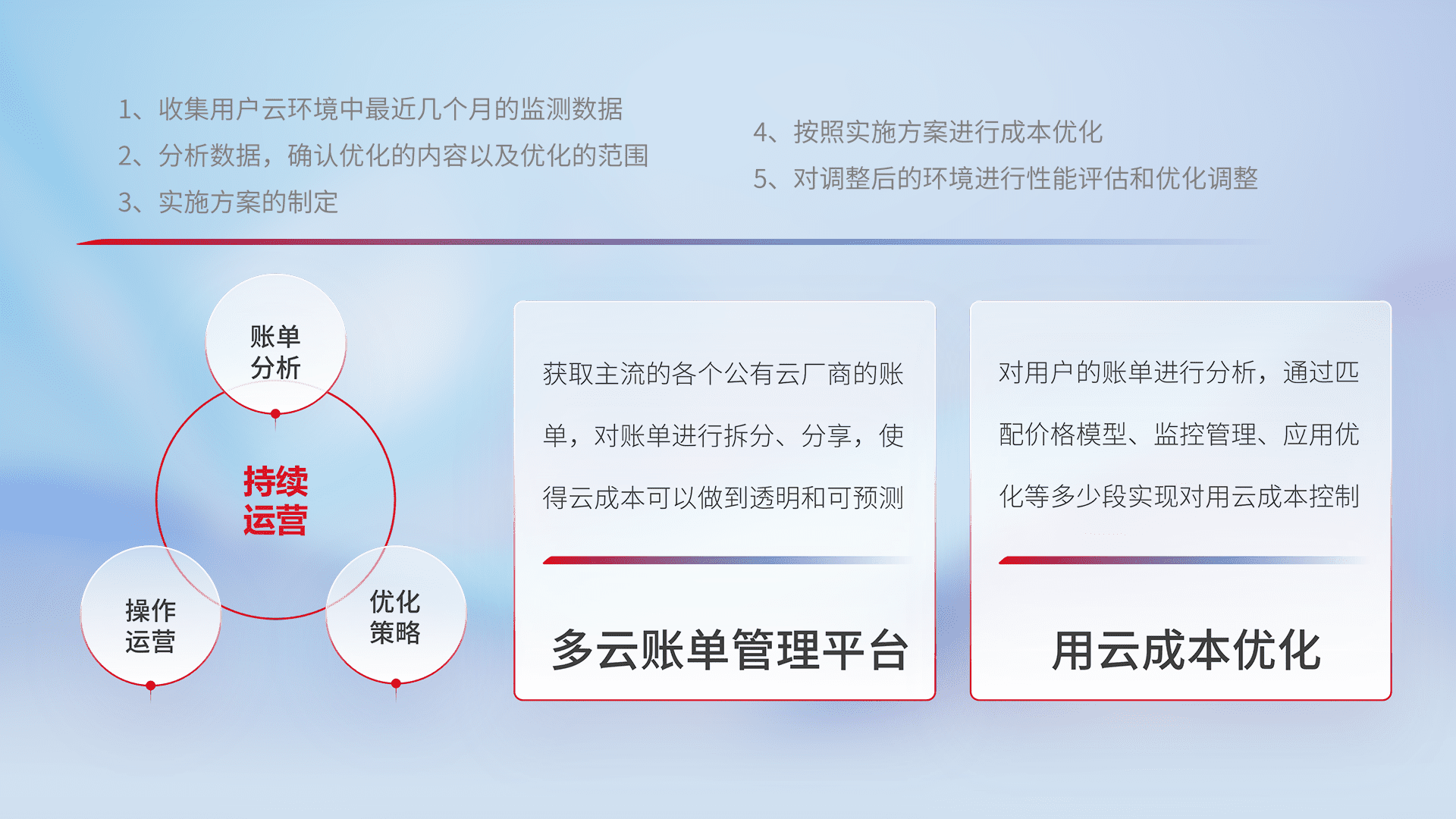 通过灵活运用多种自动化迁移工具,,,,帮助企业用户实现业务和数据高效 、、、稳定的上云迁移和云上迁移,,,采用自研多云纳管平台,,以中立管理模式,,,解决多组织、、、、多云、、多运维厂商的复杂关系的管理,,,保证多云平台资源配置的一致性,,实时掌控云资源运行数据,,,,运用智能化工具分析云资源多云平台的管理服务,,,透明化管理成本支出,,,,用云成本可预测、、用云费用可优化、、、云资源配额有据可依。。