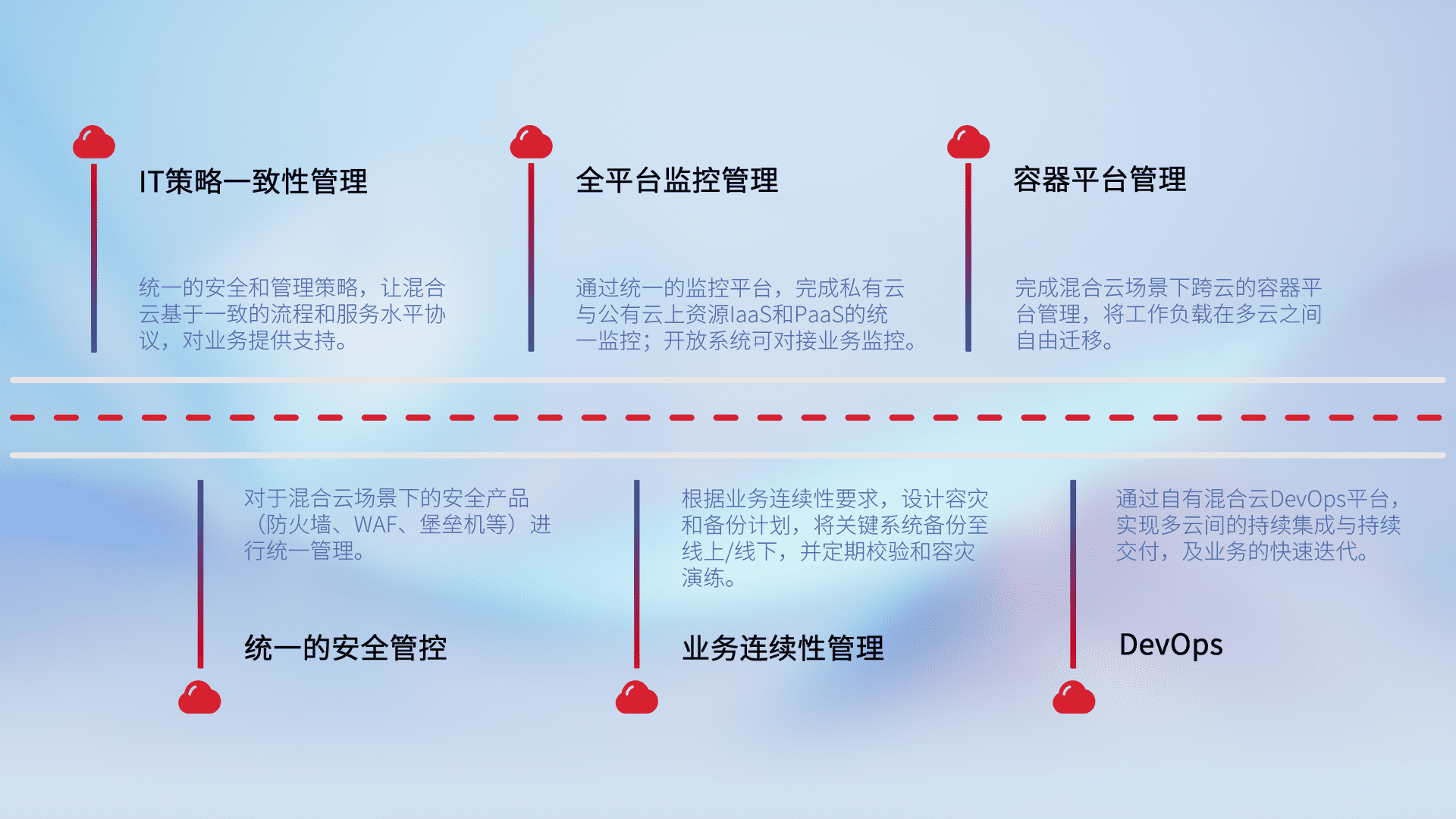 通过多云纳管,,,,以统一的资源数据模型把客户的云资源进行抽象和封装,,,进而实现对多云资源的统一操作,,,保障云资源管理的可靠性、、稳定性与可用性。。。。量身定制化运维内容,,配置、、开发运维、、、补丁管理、、、、备份、、监控、、、、认证和访问管理、、、审计和日常巡检等,,,,保障在用云过程中的可靠度,,稳定度以及高可用率。。