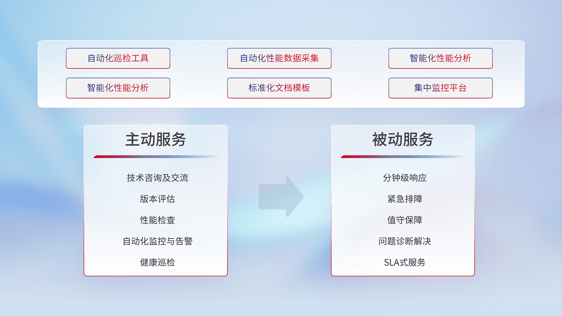 智能化工具和标准化文档,,保障服务质量,,提供主动服务(包含技术咨询、、、、版本评估、、、、性能检查、、自动化监控与告警、、健康巡检)和被动服务包含(分钟级响应、、、紧急排障、、、、值守保障、、问题诊断解决、、SLA服务)。。。